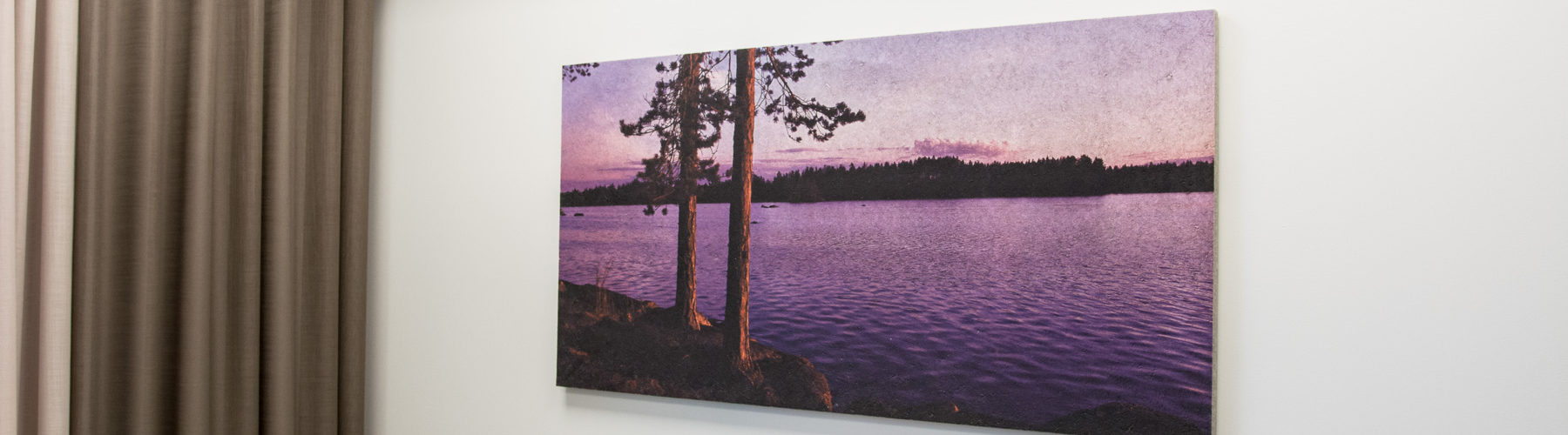 Karvia yhtenäiskoulu got a brand new canteen for the upcoming semester. Since the lunch rooms tend to be a bit noisy, Konto acoustics was there to help. A view of Kauhaneva national park was printed on three large pieces of acoustic panel with total width of 7,2 and height of 1,2 metres. The panorama view does not only look amazing but also dampens the noises of this big space.